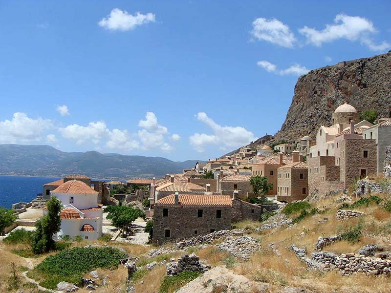Monemvasia is a town and municipality in Laconia, Greece. The town is located on a small island off the east coast of the Peloponnese, surrounded by the Myrtoan Sea. The island is connected to the mainland by a short causeway 200 metres in length. Its area consists mostly of a large plateau some 100 metres above sea level, up to 300 metres wide and 1 km long. Founded in the sixth century, and thus one of the oldest continually-inhabited fortified towns in Europe, the town is the site of a once-powerful medieval fortress, and was at one point one of the most important commercial centres in the Eastern Mediterranean (see below). The town’s walls and many Byzantine churches remain as testaments to the town’s history. Today, the seat of the municipality of Monemvasia is the town of Molaoi.